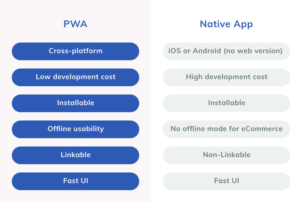 First, to preface, here are three key differences of Progressive Web Apps vs native apps.